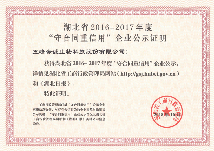 2018.10 湖北省2016-2017年度“守合同重信用”企業(yè)公示證明