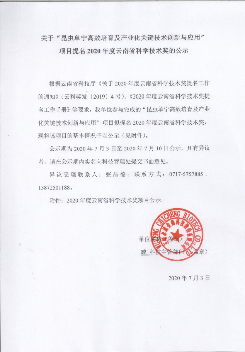 關(guān)于“昆蟲單寧高效培育及產(chǎn)業(yè)化關(guān)鍵技術(shù)創(chuàng)新與應(yīng)用”項(xiàng)目提名2020年度云南省科學(xué)技術(shù)獎(jiǎng)公示